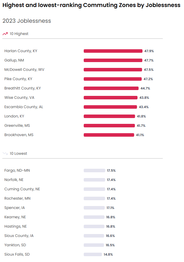 Going back to the 2023 data, we can look at the joblessness rates for the top and bottom 10 commuting zones (CZs).