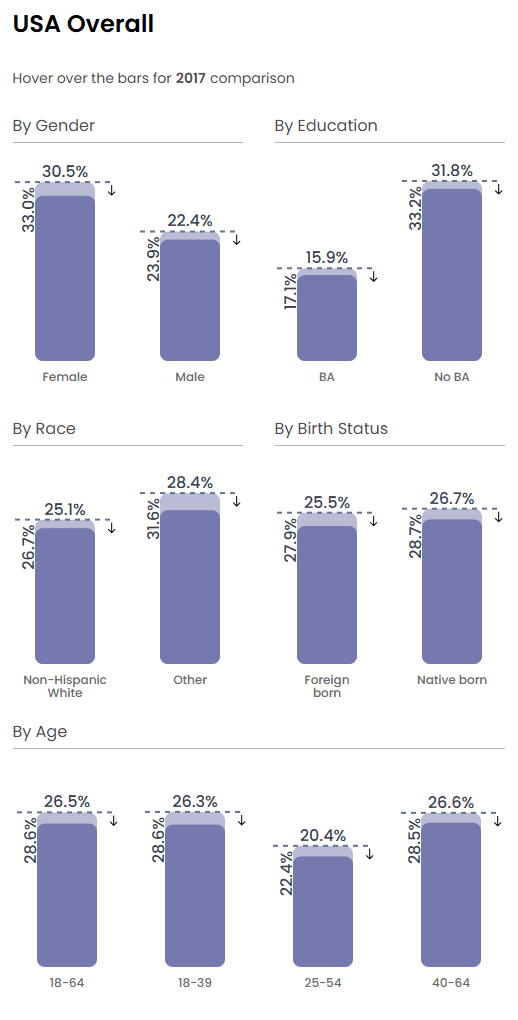 Using "Step 2: Filter data" above the map, you can restrict the data to only those with a BA by selecting "BA" in the "Education" dropdown menu. When you do, you'll see that the highest joblessness rate for people with a BA is 30.0%. In other words, the highest rate of joblessness for people with a BA is lower than the average rate of joblessness for people without a BA (30.0% versus 31.8%).